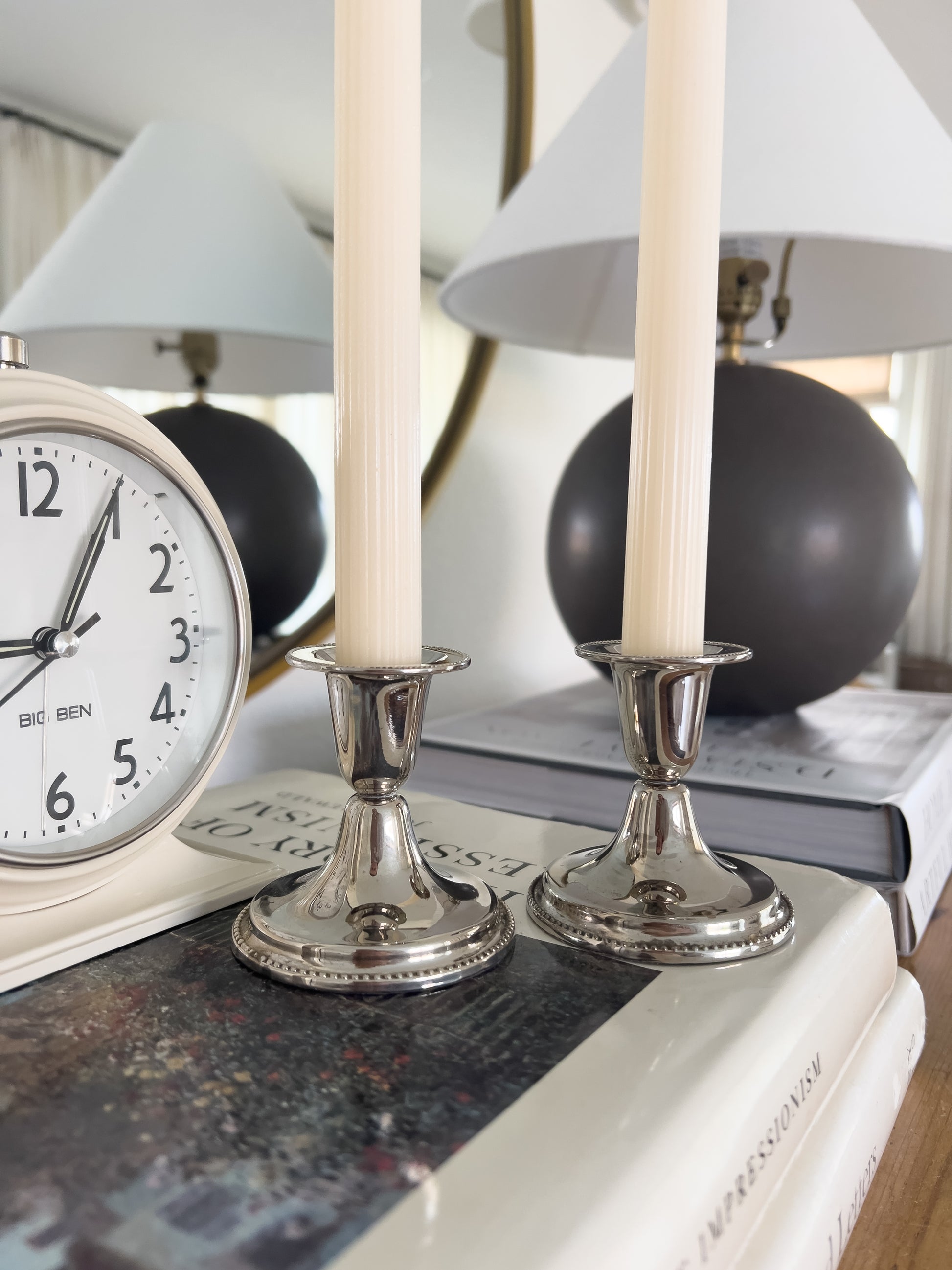 Set of two taper holders silver plated, with patina and signs of wear aligning with vintage age of the item. Beautiful beaded upper and lower edges.