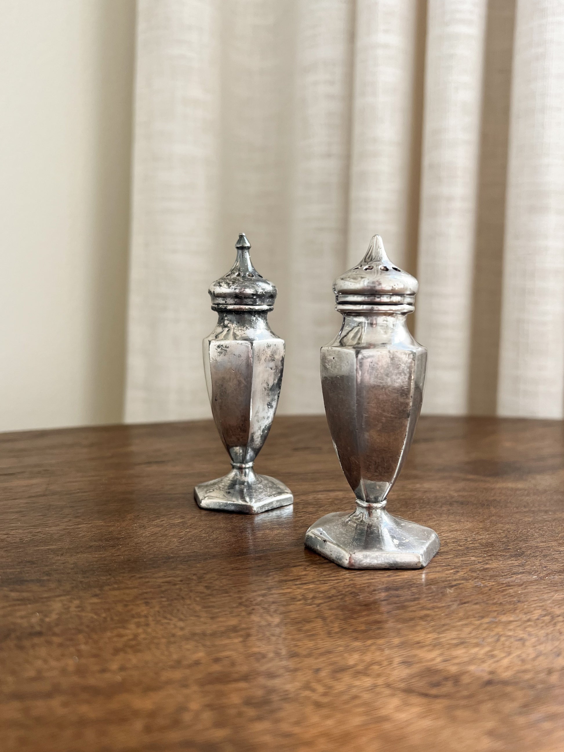 Charming pair of vintage silverplate salt and pepper shakers. Each features an elegant, faceted body with a pointed finial top and hexagonal base. Lovely aged silver patina can be left as is, or polished to a high shine if that is your preference. these petite shakers make a beautiful addition to a table setting or a display of collected silver.